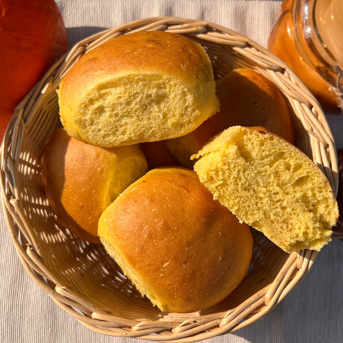 Goldgelb, fluffig und mit feiner Kürbisnote: Unsere Kürbisbrötchen machen jedes Frühstück zum Genuss.